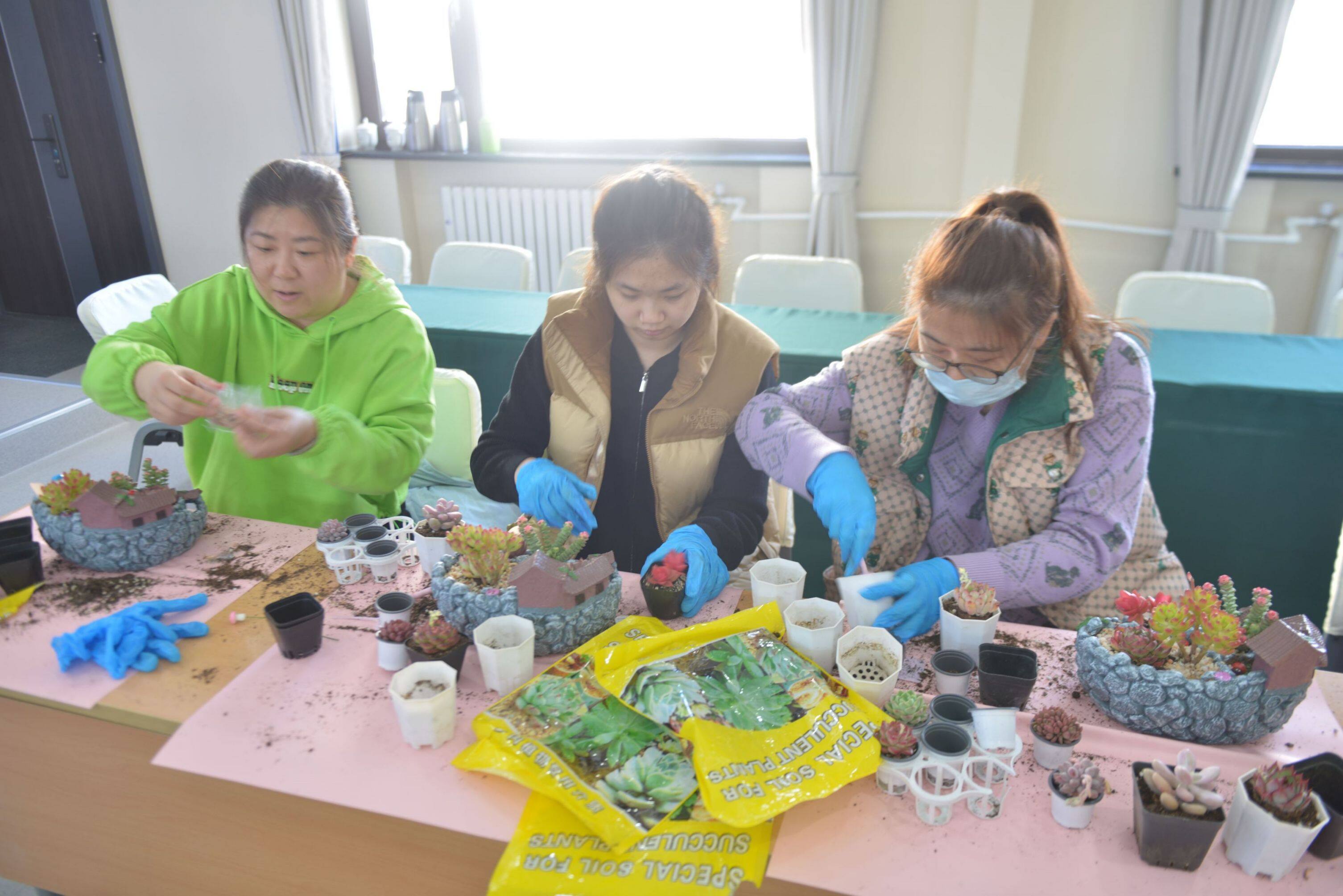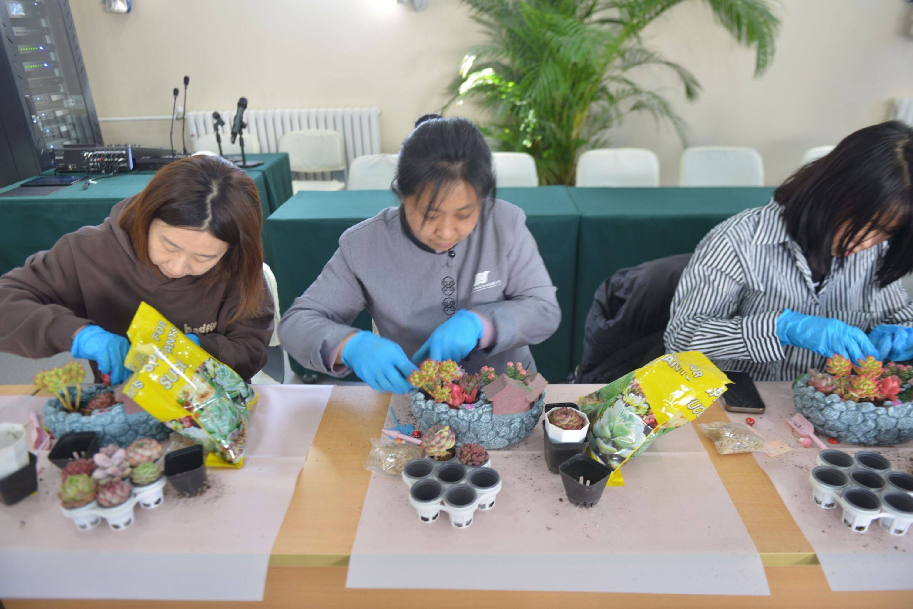 活動(dòng)現(xiàn)場(chǎng),專業(yè)老師詳細(xì)講解了多肉植物的相關(guān)知識(shí),包括多肉植物的種類、生長(zhǎng)習(xí)性、養(yǎng)護(hù)技巧等。女職工們聽得津津有味,對(duì)多肉植物有了更深入的了解。隨后,大家親自動(dòng)手積極參與到DIY過程中,制作屬于自己的多肉植物復(fù)古花園庭院。女職工們充分發(fā)揮創(chuàng)意,從挑選植物到設(shè)計(jì)布局,再到親手栽種和裝飾,打造出一座座充滿藝術(shù)感和生命力的花園庭院。