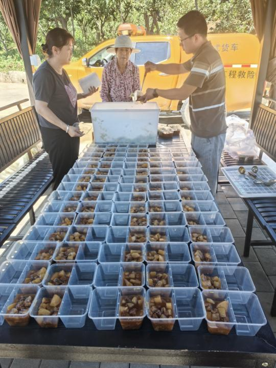“民以食為天”,為了讓一線搶修人員吃好,公司專門落實餐飲供應。廚師每天都會準備可口的飯菜,保證一葷一素的營養搭配,讓一線同志們在辛苦工作后能夠吃上熱乎、美味的食物。后勤保障組的孫海艷認真記錄飲食和施工人員的需求,“只要天公作美,一線同志就一直全力搶修。我們作為后勤人員必須全力保障他們的需求,讓他們沒有后顧之憂。” 孫姐樸實的話語道出了后勤人員的心聲。